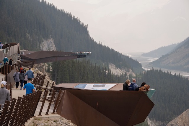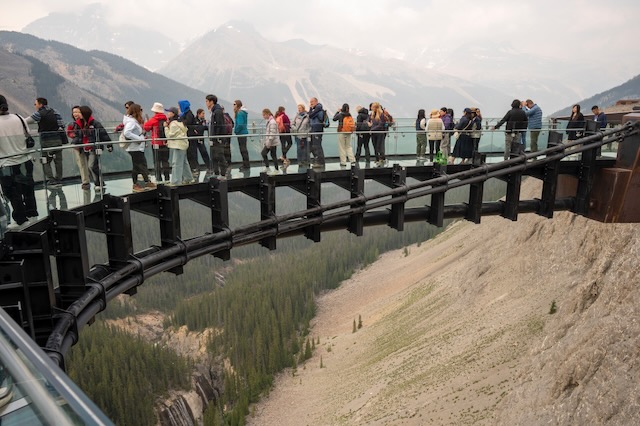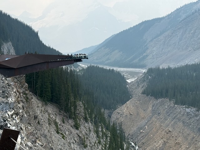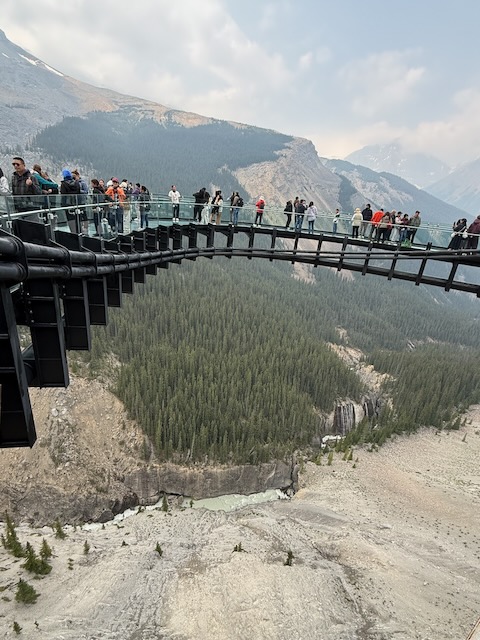 After walking and playing on the glacier we again boarded our Explorer vehicle and returned to the Transfer bay. From there, the shuttle bus took us to the glass-floored Columbia Icefield Skywalk, suspended 918 feet above the rugged and Sunwapta Valley. How do you feel about heights, standing on glass and looking straight down?