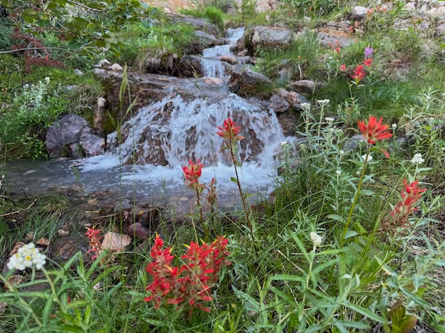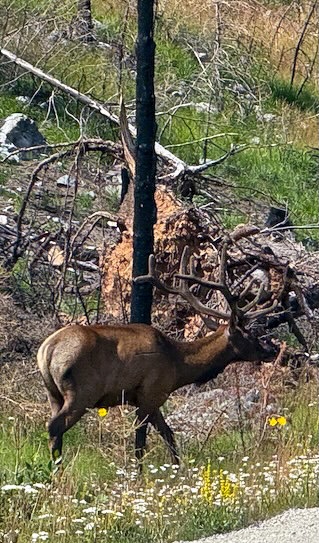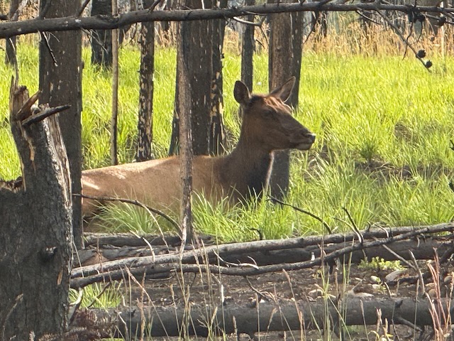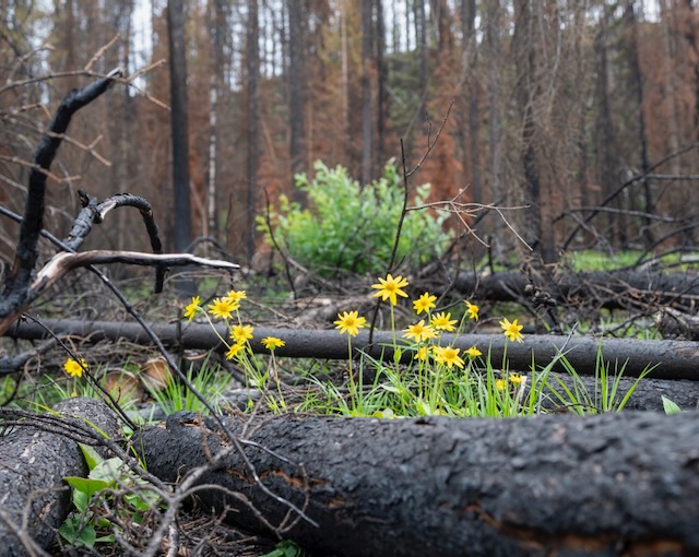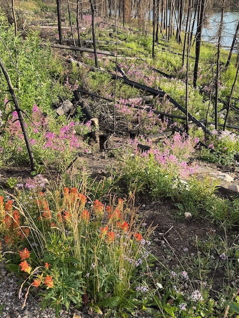 As we drove closer to Jasper, the fire damage was everywhere. It’s hard to see in the photos below but the burnt trees extend to the top of the hills. The devastation was heart-breaking but the wildlife, wildflowers, and bits of green indicate resilience.