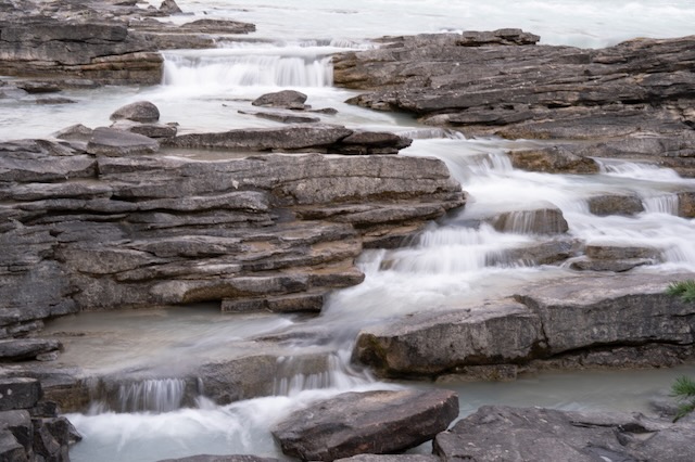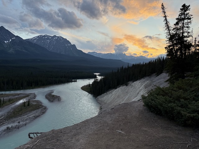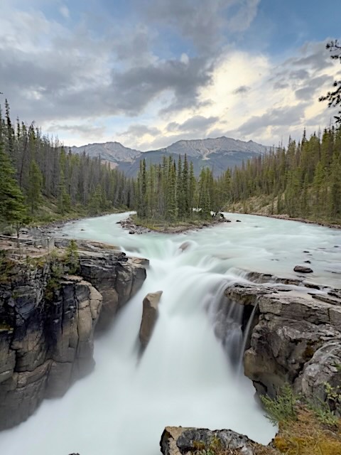 For our last adventure in Jasper National Park, we had arranged a Golden Hour Photography and Wildlife Tour with Jasper Photo Tours. Our guide picked us up at the campground office at 6 p.m. and we took off on a 4 hour tour. We found elk just outside the campground but our hunt for bear and other wildlife was unsuccessful – not for lack of trying. He drove to several of the most likely spots but no luck. Then, as the sun was lowering, he took us to several waterfalls – Athabasca Falls, Sunwapta Falls, and Chutes and Goats (where we looked for but didn’t see mountain goats).