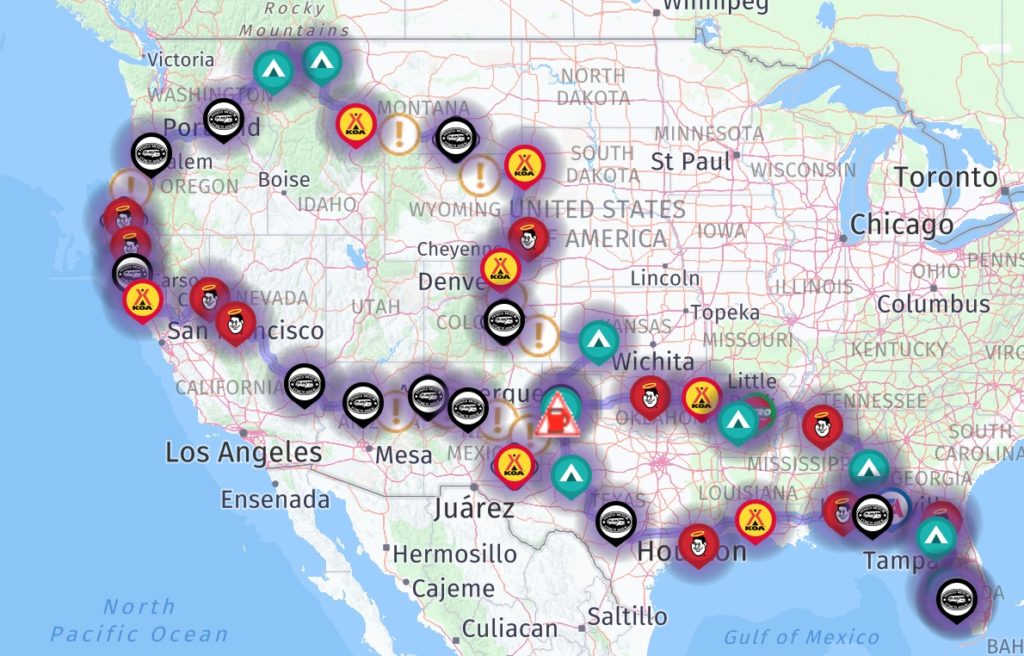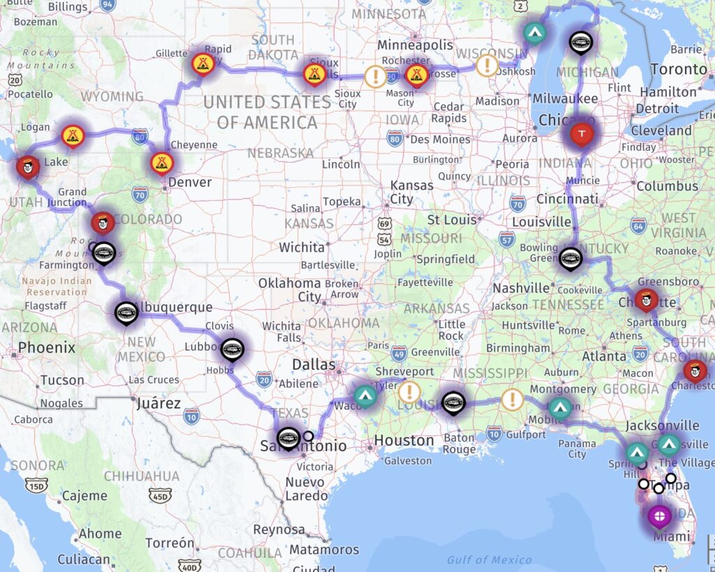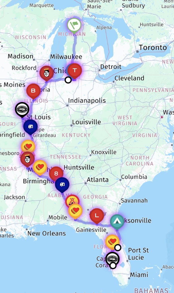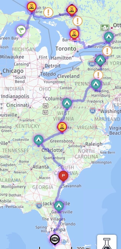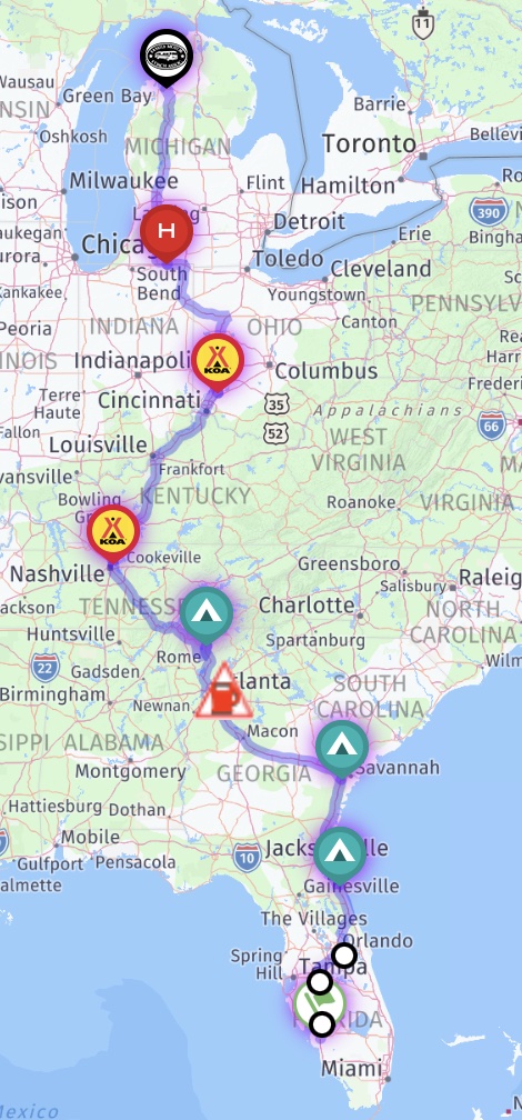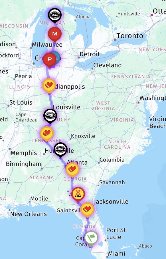 This year we spent 3 weeks on a Viking River Cruise from Amsterdam to Budapest (details are in the blog) prior to traveling from our lot in Ft. Myers to the lot in Michigan. Here is the route we took between Florida and Michigan.